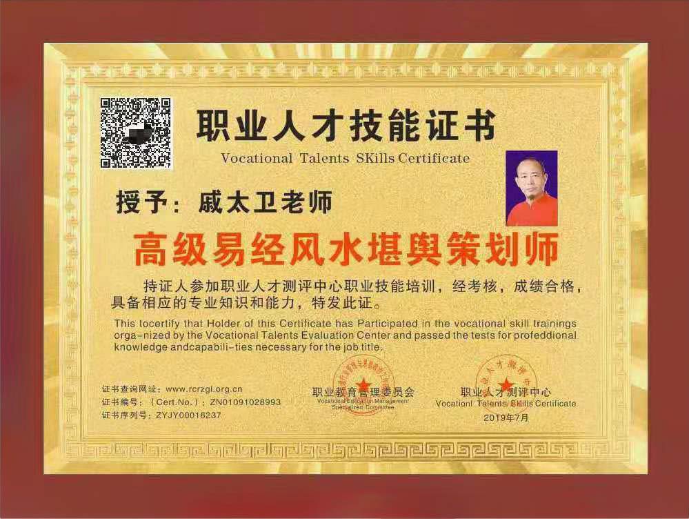 2019年职业人才技能培训成绩合格:获高级易经堪舆策划师;