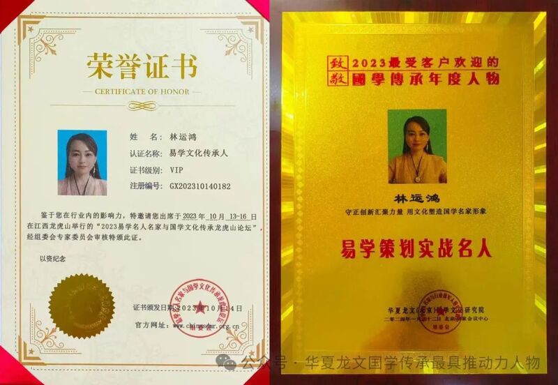 在求学过程中,林运鸿不仅勤奋刻苦,更是心怀天下,不断追求更高的学问和境界。她游历四方,遍访名师,从事二十多年的实战经验,深入研习六爻占卜、命理解析、地理堪舆、数理吉凶等专业知识,虽未至大成之境,但已能窥见其中奥妙。她更在阳宅家居风水、企业、公司 、工厂布局及祖祠定向等方面,积累了丰富的实战经验,为无数有缘人排忧解难,指点迷津。并收到无数无孕福主、病灾家庭、公司企业等人士寄来荣誉锦旗!